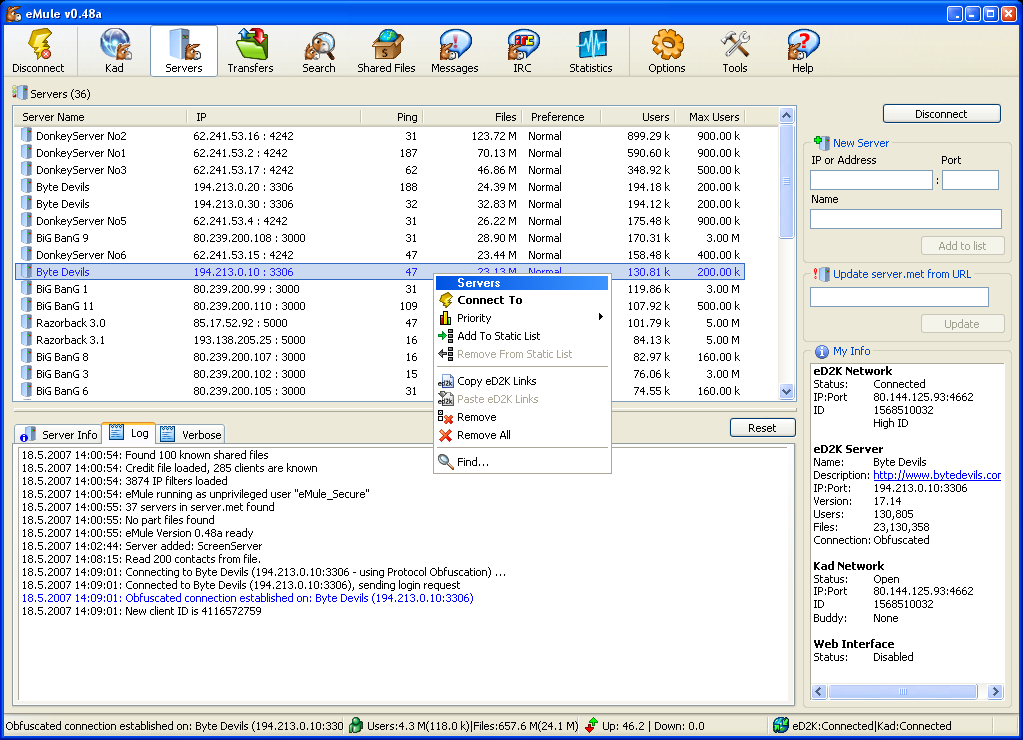 Das Serverfenster zeigt alle Informationen über die ED2K-Server zu denen sich eMule verbinden kann.