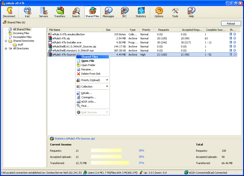Dieses Fenster zeigt alle lokalen Dateien die über eMule für andere Benutzern zum herunterladen freigegeben sind.